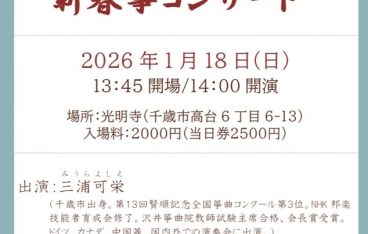 公演情報 2026年1月18日(日)新春箏コンサートに出演します Twitter icon 2026年1月18日(土)新春箏コンサート13:45開場 14:00 開演場所:光明寺https://chitose-eniwa.mypl.net/shop/00000365260入場料:2,000円(当日券2,500円)
